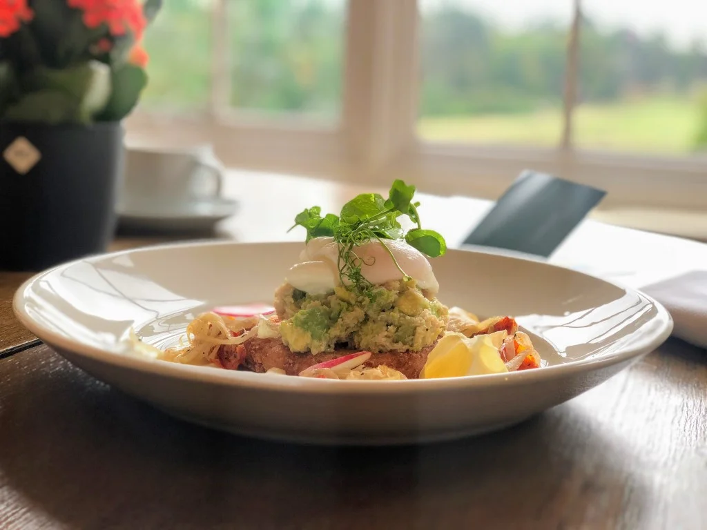 Note the 1st hole stretching behind the salmon, poached egg, avocado and crab breakfast at Swinley Forest.