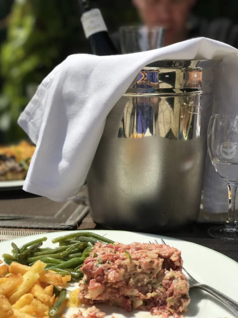 Steak tartate, frites and vin blanc on the terrace at Morfontaine